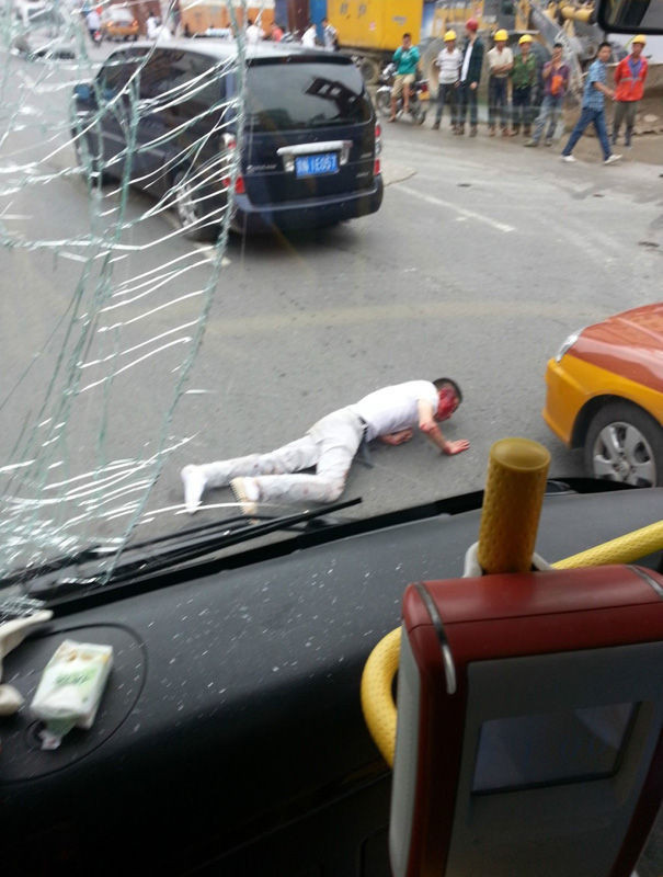 Người đàn ông này rơi trúng vào chiếc xe bus số 107 đang chạy trên đường làm kính trước xe bus vỡ tan. Sau khi lồm cồm bò dậy, mặt mày máu me be bét, anh ta lại tiếp tục ra giữa đường chặn xe cộ qua lại cho đến khi bị cảnh sát đến đưa về đồn.