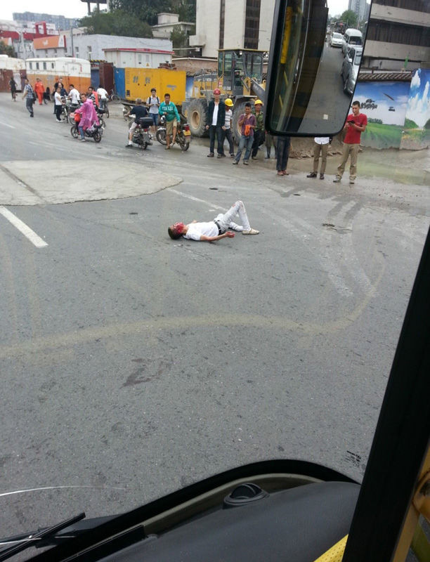 Sau khi nhảy cầu không chết, người đàn ông này tiếp tục nằm lăn ra giữa đường ăn vạ. Những người dân hiếu kỳ xúm quanh bình phẩm.