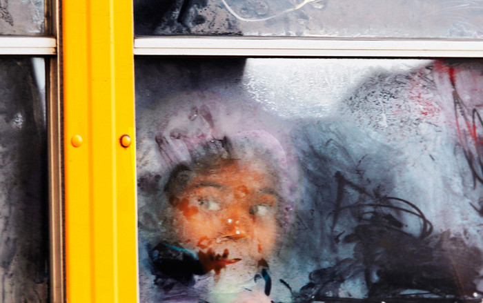 | Một người vô gia cư cố nhờ chút hơi ấm từ chiếc xe để sưởi. |
