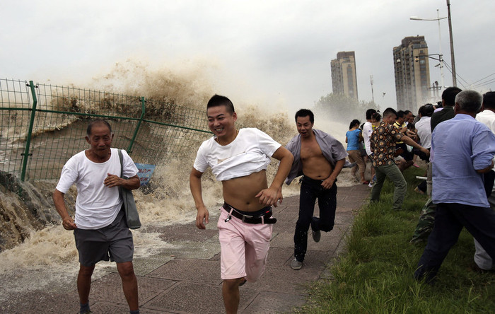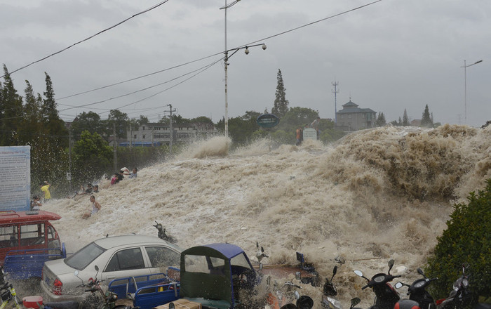 Ngày 22/8 do ảnh hưởng của cơn bão mạnh Trami, khu vực cửa sông Tiền Giang thuộc tỉnh Chiết Giang, Trung Quốc thủy triều cao bất ngờ so với mọi ngày thu hút khá nhiều người dân hiếu kỳ và khách du lịch tới xem.