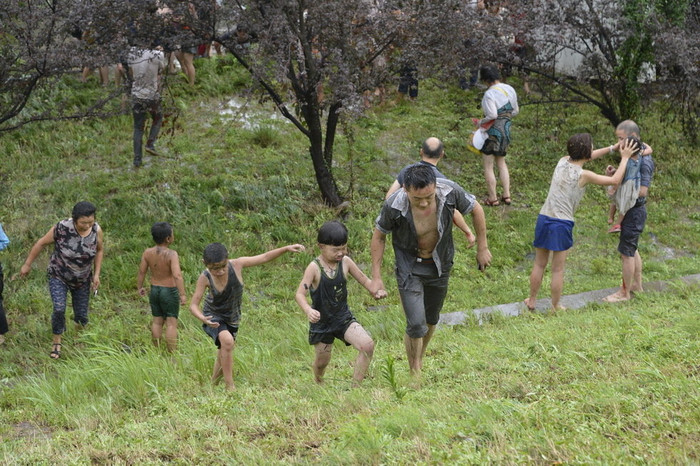 Người lớn, trẻ nhỏ ai nấy đều ướt như chuột lột sau con sóng dữ.