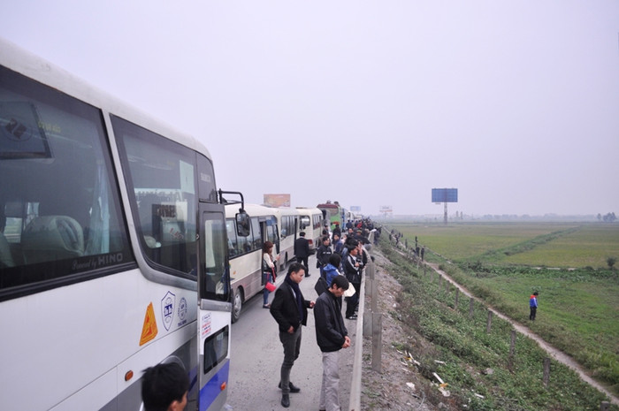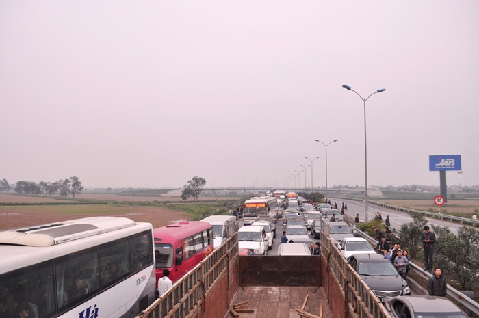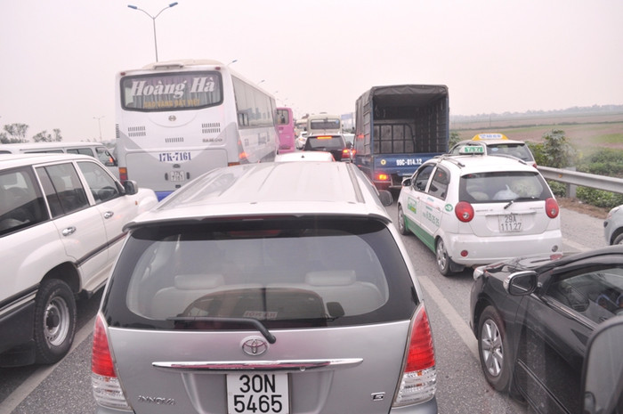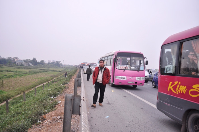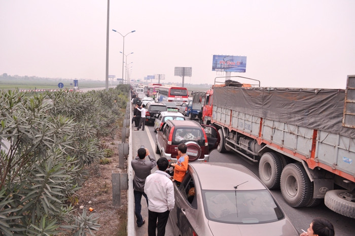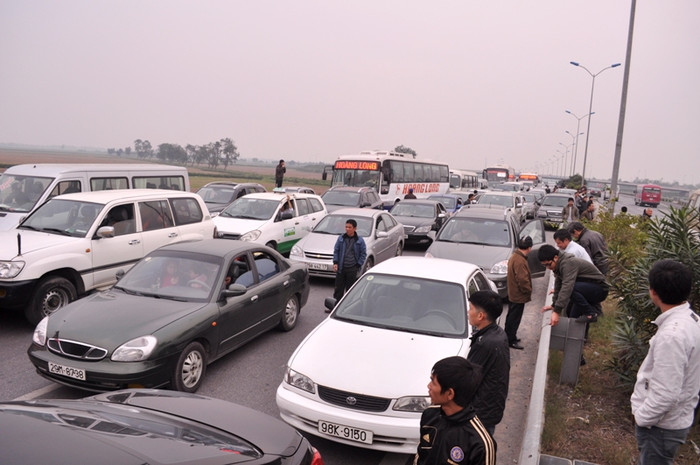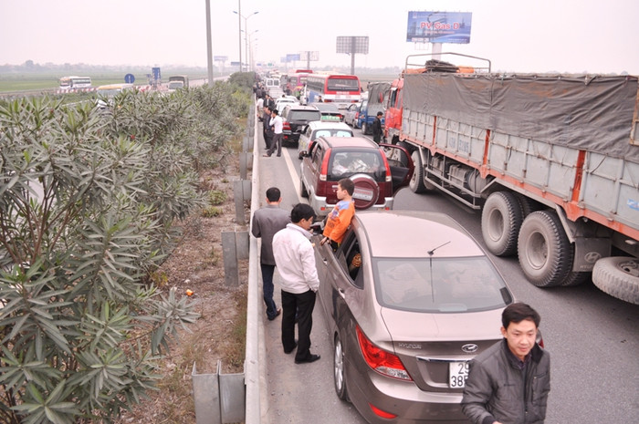 | Nhiều lái xe đã ra khỏi xe để chờ cho hết tắc đường |