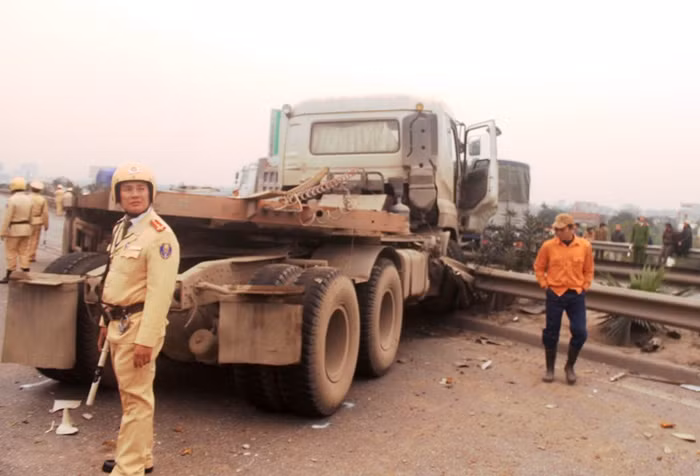 | Cùng lúc đó, chiếc ô tô ISUZU mang BKS: 29V - 3667 đi ngay sau xe container cũng đã bị chiếc xe này ép lao lên dải phân cách. Tại hiện trường, chiếc xe KIA bị biến dạng phần đuôi xe, chiếc xe container gập đôi xe, phần đầu nằm chắn ngang dải phân cách. Còn chiếc xe IZUZU bị biến dạng phần đầu bên phải. |
