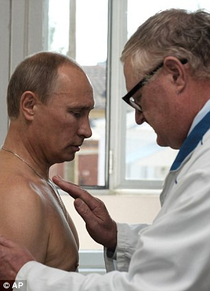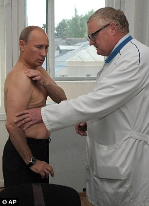 Nhà lãnh đạo năng động và mạnh mẽ 58 tuổi của nước Nga đã nhanh chóng cởi áo cho bác sĩ kiểm tra phần vai trái bị chấn thương - kết quả của một lần tập thể dục buổi sáng.