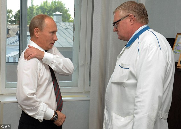 | Bác sĩ kiểm tra phần vai trái bị chấn thương dai dẳng của Thủ tướng Putin |