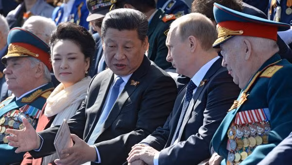 | Vợ chồng nhà lãnh đạo Trung Quốc Tập Cận Bình ngồi cạnh Tổng thống Putin trên khán đài. |