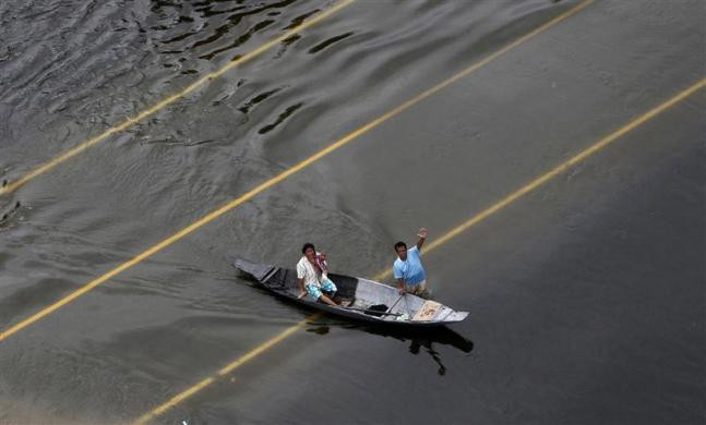 | Người dân Bangkok dùng thuyển làm phương tiện di chuyển trong lũ ngày 10/10/2011 |