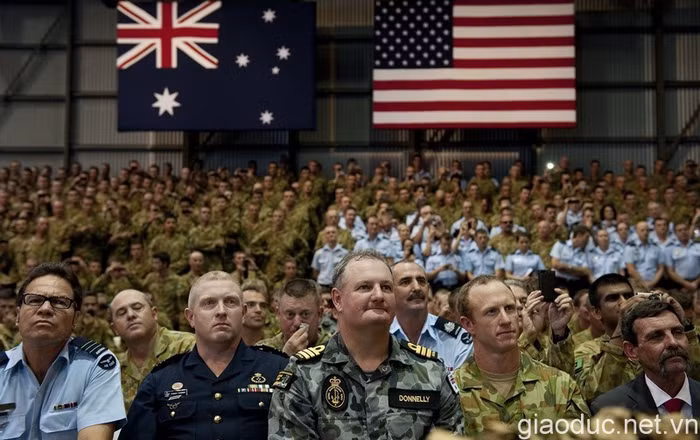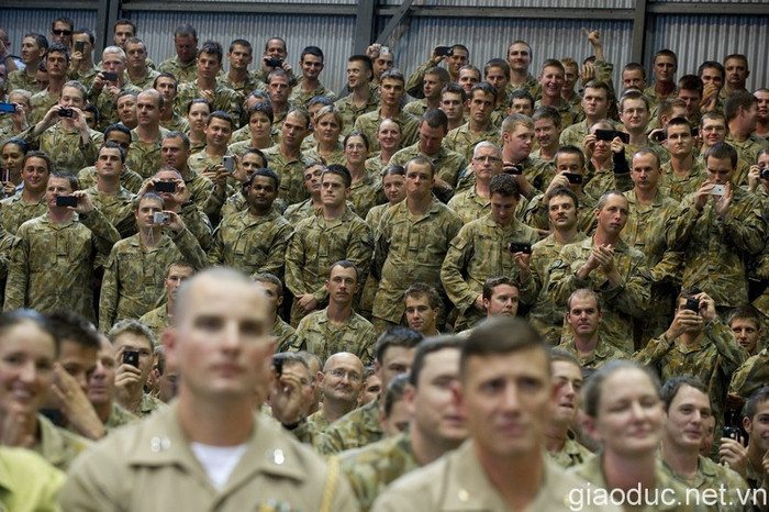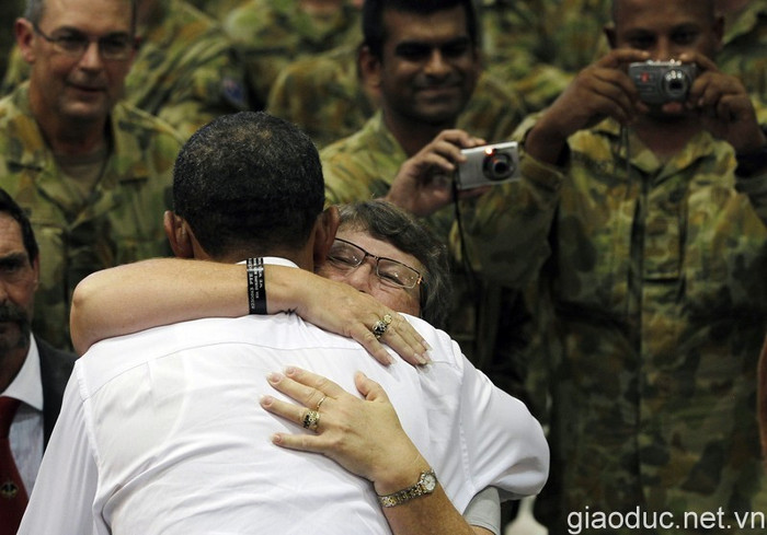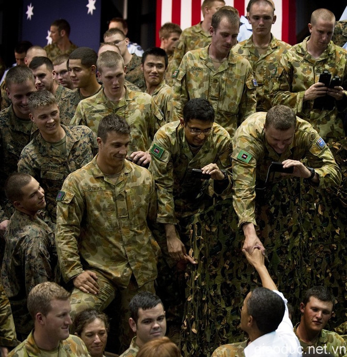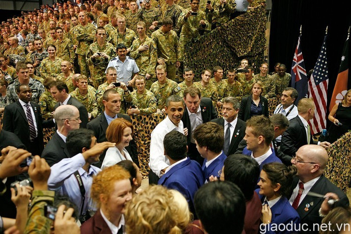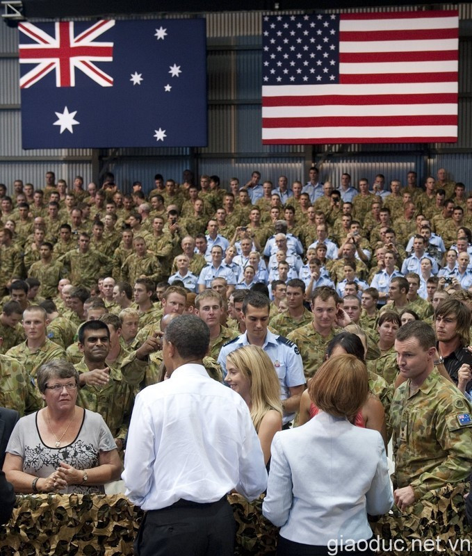 | Thủ tướng Australia Julia Gillard lắng nghe bài diễn văn của Tổng thống Barack Obama tại căn cứ Darwin. |