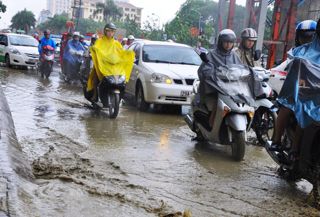 Tuy mưa không lớn nhưng do những cơn mưa kéo dài lên các ống nước không kịp thoát nước dẫn đến tình trạng ngập úng diện rộng trên các tuyến đường như Kim Mã, Phạm Văn Đồng, Bà Triệu, Giải Phóng… Có nhiều nơi mực nước trên đường cao khoảng 30 - 40 cm.