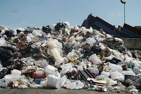 Trong hình là một bãi rác trong trung tâm phân loại rác California, Hoa Kỳ. Sau khi được phân loại đơn giản, thủy tinh và kim loại được thu gom xử lý, còn lại toàn bộ rác thải nhựa và giấy sẽ được ép lại và xuất sang Trung Quốc.