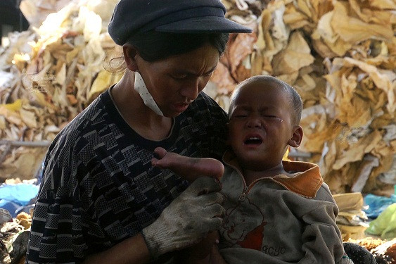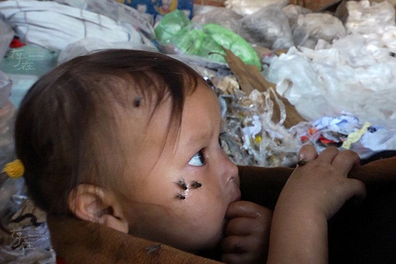 Những đứa trẻ thiếu may mắn con cái công nhân nghèo được bố mẹ mang theo vào phân loại rác từ khi còn bú mẹ đã nhiễm đủ thứ bệnh về da, về hô hấp. Đứa trẻ trong ảnh không phải trường hợp cá biệt, mà đại đa số trẻ em ở các làng nghề tái chế rác đều gặp phải vấn đề về sức khỏe.