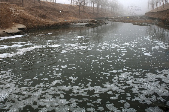 Một cái ao bị vây quanh bởi rác trong "tiểu khu công nghiệp chế biến rác" ở tỉnh Hà Bắc, Trung Quốc nước biến thành màu đỏ vì ô nhiễm. Mặc dù địa phương cũng đã hô hào tổ chức xử lý ô nhiễm nguồn nước, nhưng chẳng có thứ sinh vật nào sống được ở ao nước như thế này.