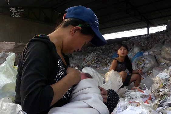 Cho con bú ngay giữa đống rác thải. Vừa làm vừa có thể trông con, thậm chí bọn trẻ cũng được người lớn huy động tham gia phân loại rác.