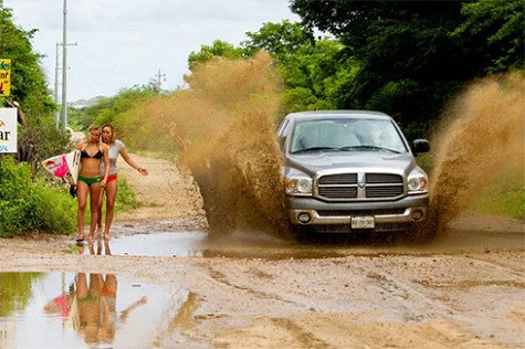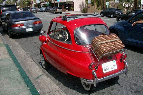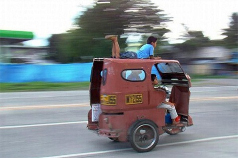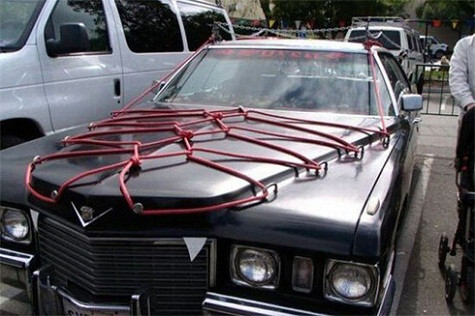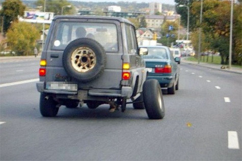 | Trên kính hậu của chiếc Fiat Panda màu vàng là dòng chữ: "Quỷ dữ lái Panda". |