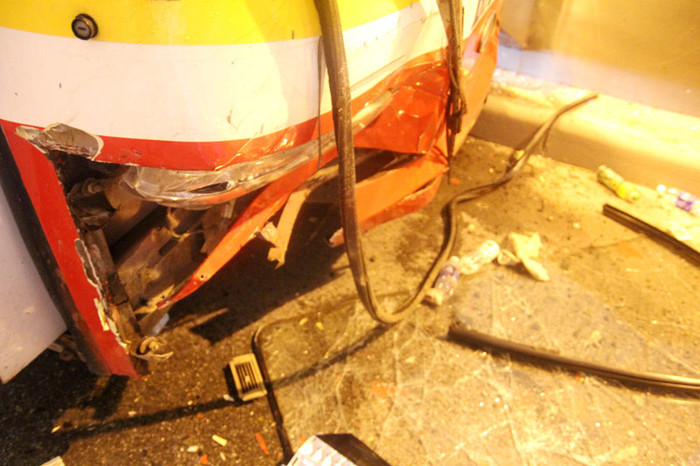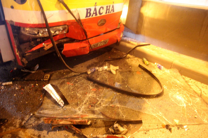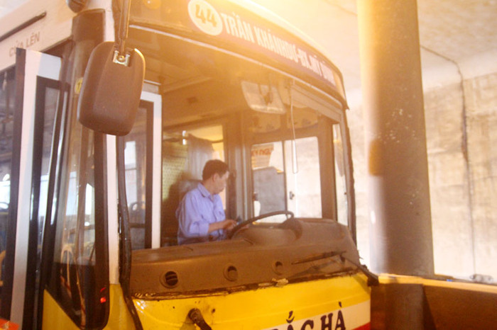 | Phần đầu của chiếc xe buýt bị hư hỏng nặng |