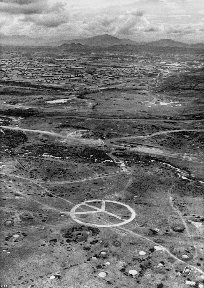 Hình ảnh trên không cho thấy biểu tượng lớn được thực hiện bằng xe ủi gần Camp Eagle, trụ sở chính của Sư Đoàn Dù 101, phía bắc Miền Nam ngày 8 tháng 5 năm 1971.
