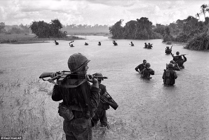 Ảnh của nhiếp ảnh gia người Pháp Henri Huet, người qua đời vào năm 1971 khi trực thăng chở ông và 3 phóng viên ảnh khác bị bắn rơi. Ảnh cho thấy cảnh lính nhảy dù của Tiểu Đoàn 2, Lữ Đoàn 173, Mỹ vác súng lội nước trong mưa bố ráp cơ sở cách mạng trong khu vực rừng Bến Cát, ngày 25 tháng 9 năm 1965.