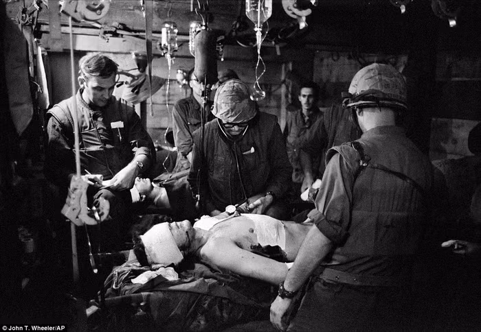 Tiến sĩ Joseph Wolfe (giữa) chăm sóc một người lính bị thương tại một bệnh viện dã chiến ngầm ở căn cứ Hải quân Khe Sanh tháng 3 năm 1968.