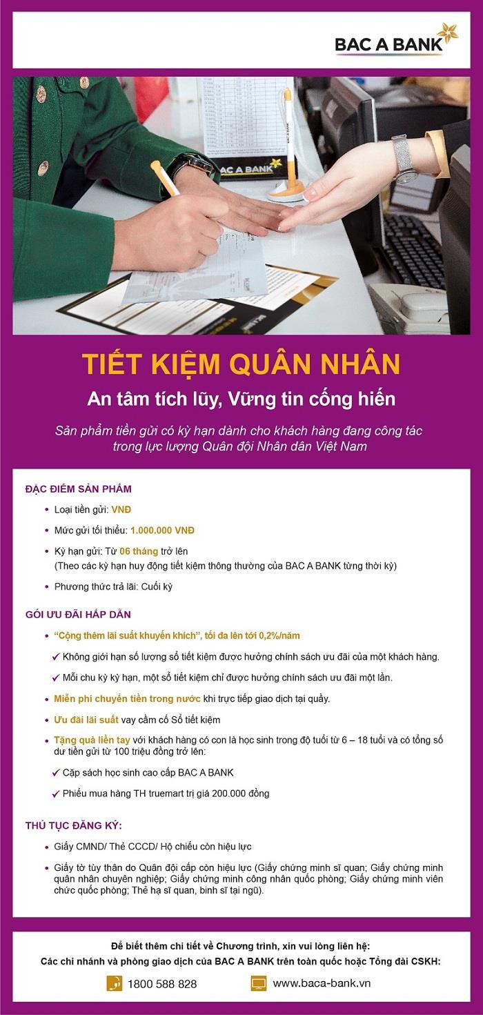 Nhân kỷ niệm 74 năm thành lập Quân đội Nhân dân Việt Nam (22/12/2018), với mong muốn tri ân những người đang ngày đêm bảo vệ sự bình yên của Tổ quốc, BAC A BANK đã chính thức ra mắt sản phẩm Tiết kiệm Quân nhân với nhiều ưu đãi hấp dẫn dành cho khách hàng và gia đình.