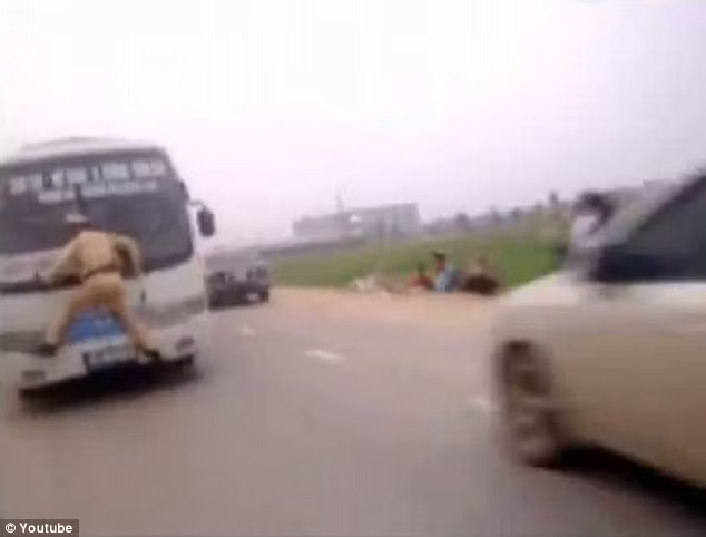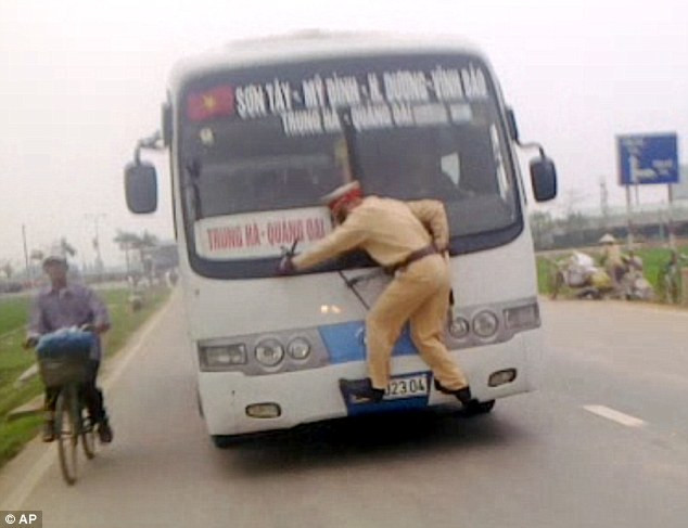 | Trung úy Phan bám kính chắn gió để ngăn lái xe phạm luật. |
