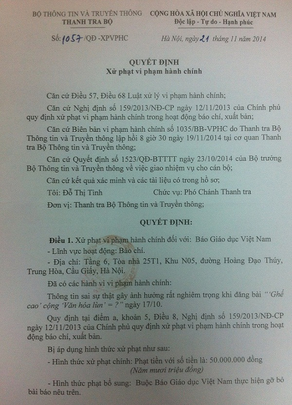 | Quyết định xử phạt của Bộ Thông tin và Truyền thông đối với Báo Giáo dục Việt Nam |