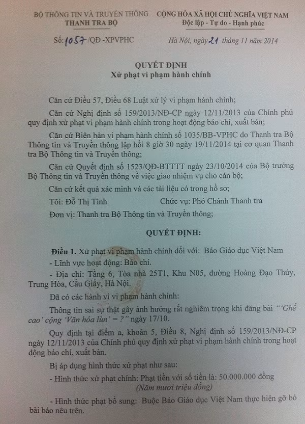 Quyết định này do bà Đỗ Thị Tình - Phó Chánh Thanh tra Bộ Thông tin và Truyền thông ký, áp dụng hình thức xử phạt 50 triệu đồng và buộc gỡ bỏ bài báo trên.