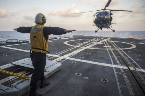 | Ngày 27 tháng 7 năm 2014, máy bay Hải quân Ấn Độ hạ cánh trên tàu chiến Mỹ trong cuộc tập trận Malabar 2014 |