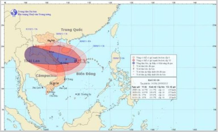 Tin từ Trung tâm Dự báo Khí tượng Thủy văn Trung ương cho biết, hồi 13 giờ ngày 29/9, vị trí tâm bão ở vào khoảng 16,7 độ Vĩ Bắc; 111,7 độ Kinh Đông, trên khu vực quần đảo Hoàng Sa. Sức gió mạnh nhất ở vùng gần tâm bão mạnh cấp 13 (tức là từ 134 đến 149 km một giờ), giật cấp 15, cấp 16.