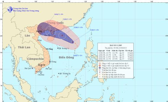 Dự báo trong 24 giờ tới, bão di chuyển theo hướng giữa Tây Bắc và Tây Tây Bắc, mỗi giờ đi được khoảng 15 – 20 km. Đến 13 giờ ngày 22/06, vị trí tâm bão ở vào khoảng 20,3 độ Vĩ Bắc; 111,7 độ kinh Đông, cách Móng Cái (Quảng Ninh) khoảng 440 km về phía Đông Đông Nam. Sức gió mạnh nhất vùng gần tâm bão mạnh cấp 9 (tức là từ 75 đến 88 km một giờ), giật cấp 10, cấp 11.