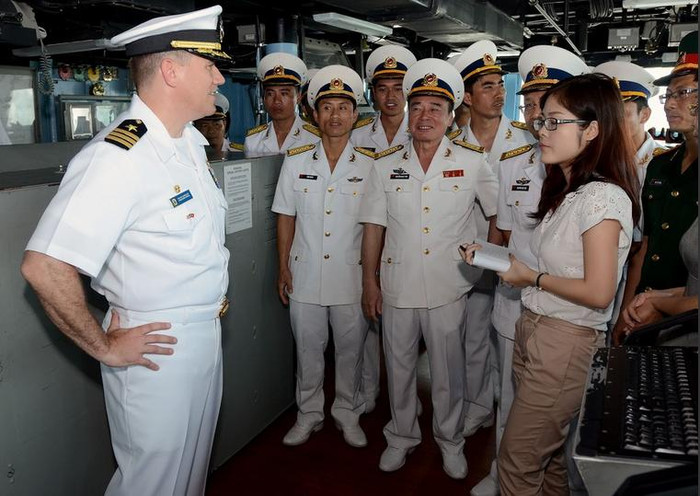 Trong quá trình thăm, cán bộ chiến sĩ Quân đội Việt Nam đã tiến hành thăm quan tàu khu trục của Quân đội Mỹ, có nữ phiên dịch viên tham gia các hoạt động này.