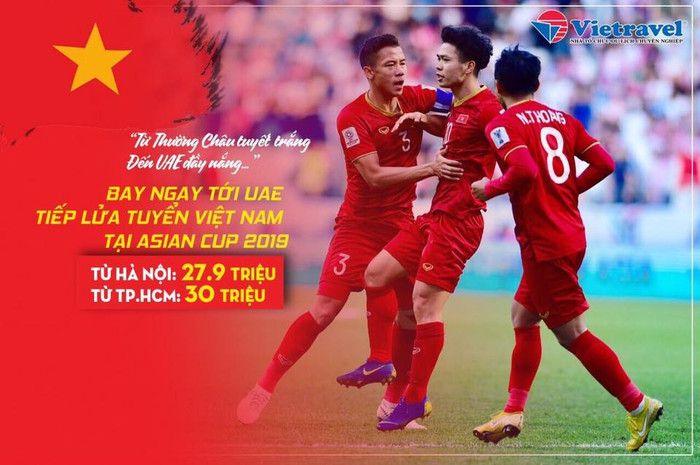 Để tiếp thêm sức mạnh, sự tự tin cho đội tuyển Việt Nam, Công ty Vietravel tiếp tục tổ chức charter bay thẳng tới UAE khởi hành ngày 24/1 cổ vũ cho các cầu thủ tại trận Tứ kết ASIAN CUP 2019.