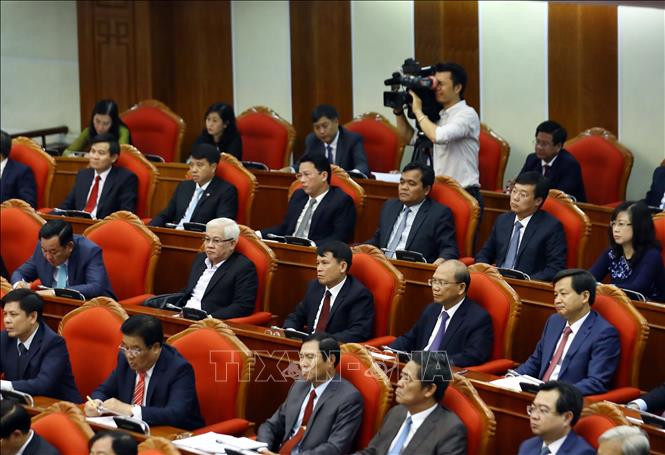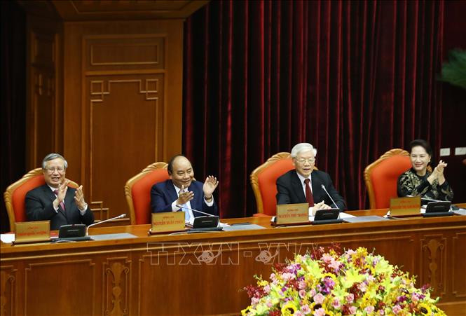 | Tổng Bí thư, Chủ tịch nước Nguyễn Phú Trọng, Thủ tướng Nguyễn Xuân Phúc, Chủ tịch Quốc hội Nguyễn Thị Kim Ngân và Uỷ viên Bộ Chính trị, Thường trực Ban Bí thư Trần Quốc Vượng biểu quyết thông qua Nghị quyết hội nghị. Ảnh: Thống Nhất/TTXVN |