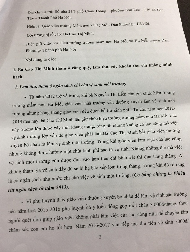 Báo Điện tử Giáo dục Việt Nam nhận được đơn thư phản ánh của cán bộ, giáo viên Trường mầm non Hạ Mỗ (Đan Phượng – Hà Nội) tố cáo bà Cao Thị Minh, Hiệu trưởng nhà trường tham ô công quỹ, lạm thu, thu chi không minh bạch, lạm dụng chức quyền, trù dập giáo viên, đối xử không công bằng với giáo viên.