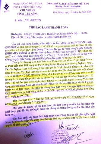 Ngày 30/12/2008, BIDV Đắk Nông đã phát hành Thư bảo lãnh số 1101/TBL-BIDV.DN có hiệu lực 01 năm. Trong quá trình thực hiện hợp đồng, bên Công ty N&S có vi phạm trong việc bàn giao mặt bằng nên BIDV Đắk Nông đã gia hạn thư bảo lãnh thanh toán số 1454/TBL-BIDV.DN đến ngày 31/03/2010. Công ty N&S tiếp tục vi phạm hợp đồng khi chậm bàn giao mặt bằng nên Công ty EEMC liên tục có công văn yêu cầu BIDV Đắk Nông thanh toán số tiền bảo lãnh theo hợp đồng. Vì theo quy định tại Điều 9.1.2, Hợp đồng số 68 thì nếu việc bàn giao mặt bằng chậm quá 60 ngày thì bên Công ty N&S có trách nhiệm thanh toán ngay toàn bộ trị giá hợp đồng cho Công ty EEMC mà không quan tâm đến điều kiện chạy thử 100 giờ. Tuy nhiên, phía BIDV đã từ chối thanh toán theo trách nhiệm của mình.