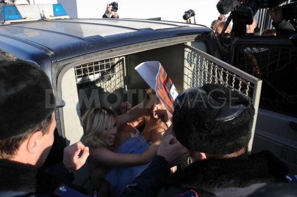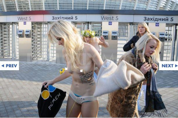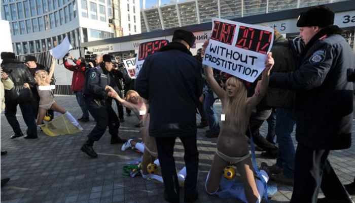 (GDVN) - Những cô gái theo phong trào biểu tinh khỏa thân FEMEN tại Ucraina hôm 3/12 đã tổ chức một cuộc biểu tình ngay trước sân vận động Olympic ở thủ đô Kiev với các khẩu hiệu "Euro 2012 không có tệ nạn mại dâm" nhằm phản đối nạn khai thác tình dục trong mùa giải bóng đá dự kiến sẽ diễn ra tại Ucraina vào tháng/2012.