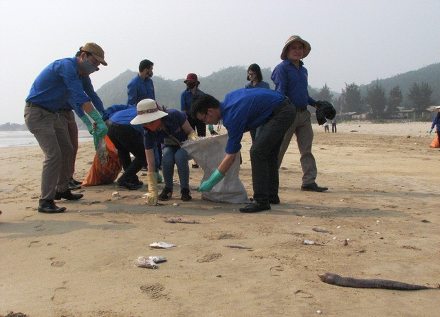| Sáng 27/4, đoàn thanh niên của Viettel Quảng Bình đi gom và đào hố chôn cá chết ở bãi tắm Đá Nhảy. Nhiều người cũng không chịu nổi vì mùi hôi thối bốc lên. (Ảnh: Thủy Phan) |