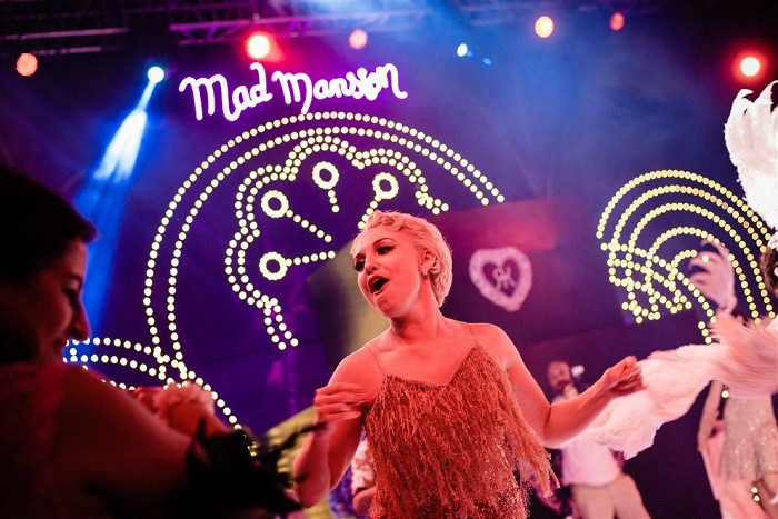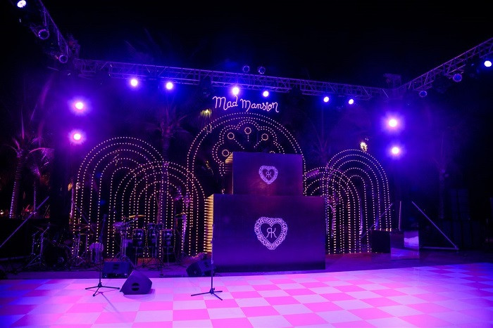 Không gian sân khấu cũng được thiết kế huyền ảo và lãng mạn với sàn diễn mang tông hồng chủ đạo. Tâm điểm là hình trái tim với logo R và K, viết tắt tên của cô dâu, chú rể, lồng vào nhau. Sân khấu đêm tiệc gợi liên tưởng đến cảm hứng Gatsby, với từ “Mad Mansion” ở trên cùng.