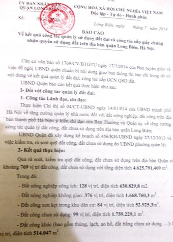 | Báo cáo của UBND quận Long Biên cho thấy mới 06 tháng đầu năm 2013 nhưng có đến 14 công trình xây dựng sai phép, không phép, xây dựng trên đất nông nghiệp, đất công. |