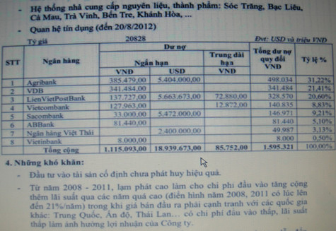| Tổng hợp dư nợ của Công ty Phương Nam tại 8 ngân hàng và kế hoạch góp vốn. Ảnh: Trúc Linh |