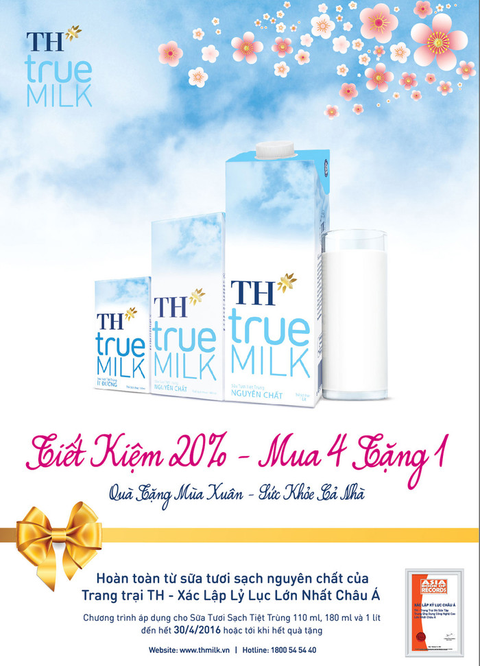 Với các sản phẩm được áp dụng là Sữa tươi sạch tiệt trùng TH true MILK hộp 110ml, 180ml, 1000ml, từ ngày 22/2/2016 đến hết ngày 30/4/2016, khi mua 4 hộp sản phẩm bất kỳ trong các sản phẩm trên, khách hàng sẽ được tặng ngay 1 hộp sản phẩm cùng dung tích.