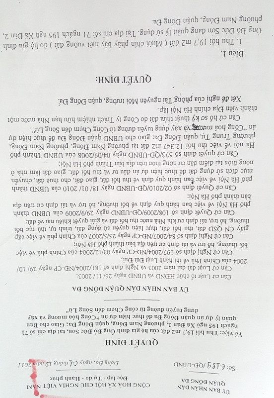 Mặc dù không hề biết có việc chính quyền thực hiện dự án “Cống hóa mương và xây dựng tuyến đường từ Cống Chèm đến Sông Lừ”, không hề biết có việc thu hồi, bồi thường… đối với căn nhà đất của mình nhưng tại Quyết định số 6189/QĐ-UBND của UBND quận Đống Đa lại ghi rõ “có xác nhận của UBND phường Nam Đồng, Ban Quản lý dự án quận Đống Đa và chủ sử dụng đất”.