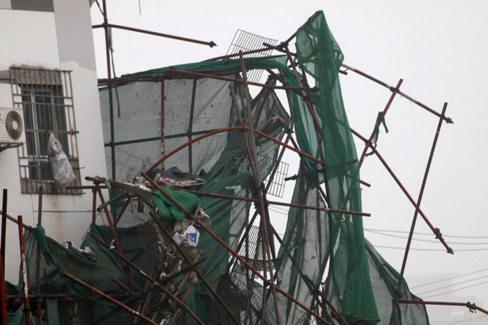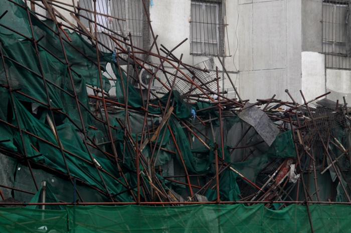 | Dàn giáo ở tầng 9 đổ xuống khiến mặt tường của tòa cao ốc 31 tầng để lại nhiều vết trượt xước kéo dài. |