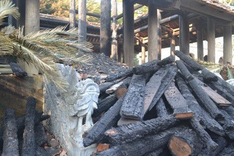 | nhiều thớ gỗ bị đốt cháy chất đống trong khuôn viên đền |