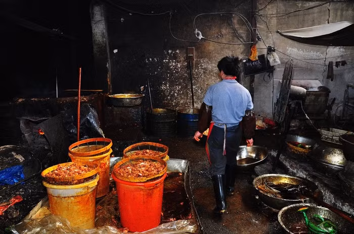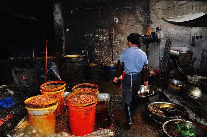 Khu vực chiên để biến thịt lợn chết thành thịt xiên nướng. Xưởng chế biến thịt xiên nướng "bẩn" này được phát hiện tại thôn Tân Trang đường Dương Kim, thị trấn Liễu Lâm khu Kim Thủy, Trịnh Châu ngày 31/3.