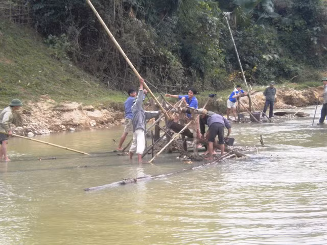 | Từng nhóm người chia nhau các góc sông lặn ngụp, đào, đãi tìm... vàng vụn |