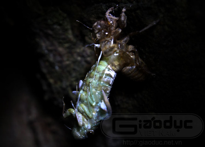 | Khi những con ấu trùng ve rời khỏi hang và leo lên những thân cây ở góc tối, chúng bắt đầu "hành trình thoát xác". |