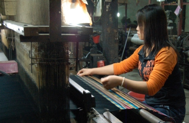 | Nhuộm lụa, khâu đầu tiên để tạo ra những tấm lụa mềm mại. Màu chủ yếu là phẩm màu công nghiệp. |