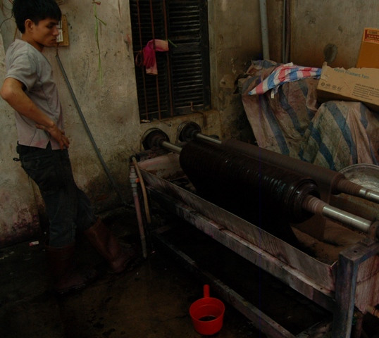 | Sau khi lụa được nhuộm, chờ khoảng 30 phút cho lên màu, những tấm lụa sẽ được đem giặt |