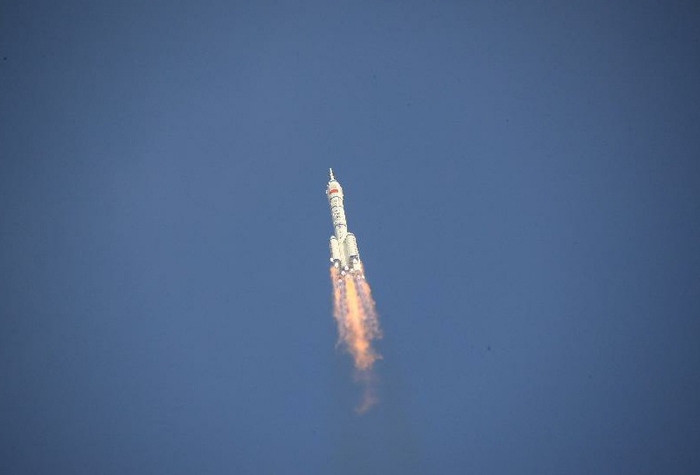 | Con tàu được phóng lên trên tên lửa đẩy Trường Chinh-2F ở bãi phóng của tỉnh Cam Túc, phía tây bắc Trung Quốc. |