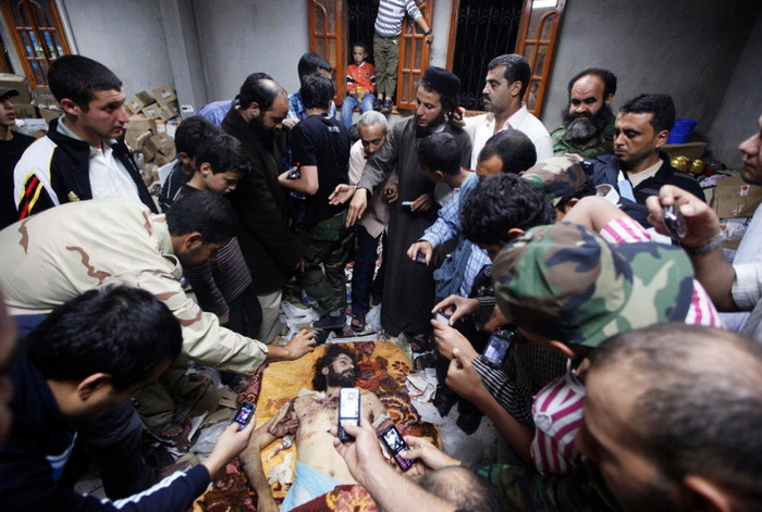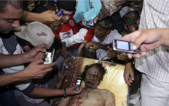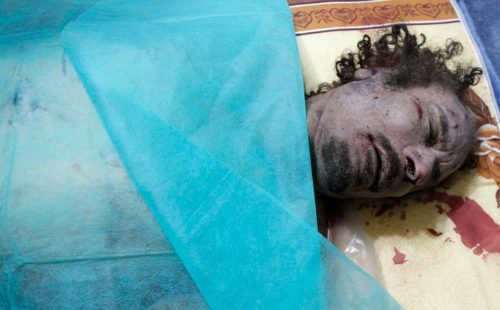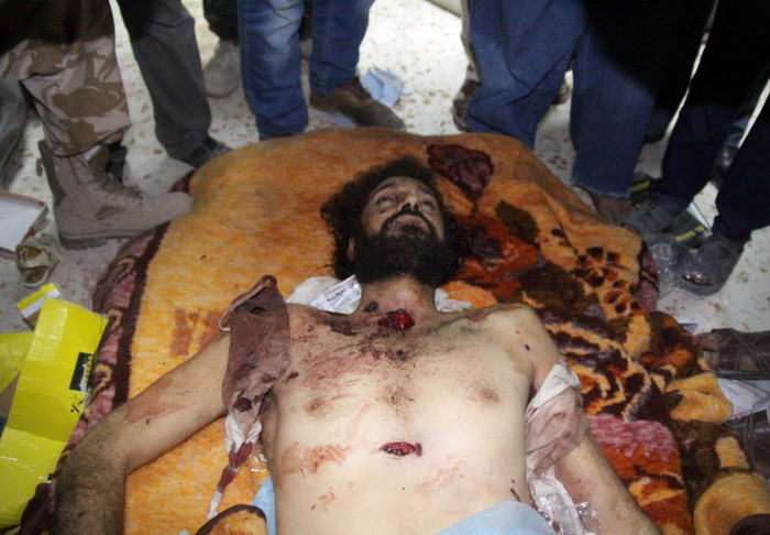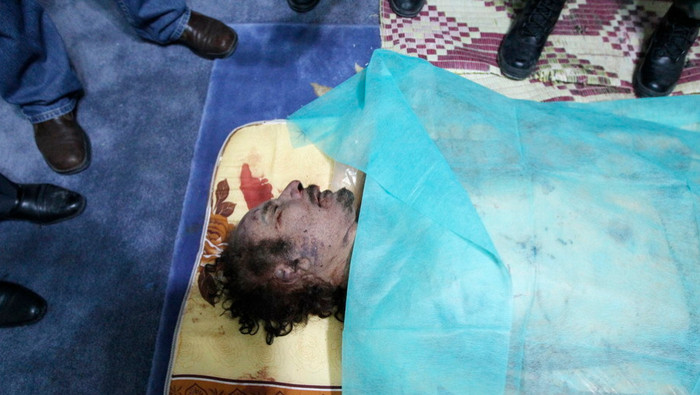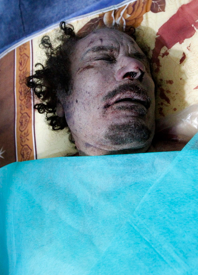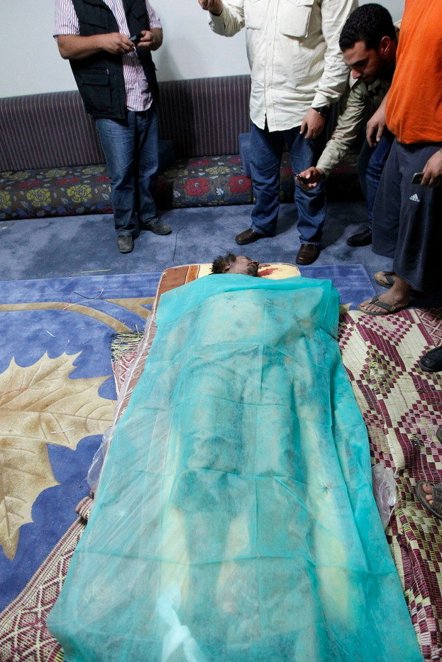 (GDVN) - Những bức ảnh chụp cận cảnh thi thể của đại tá, cựu lãnh đạo chính quyền Libya Muammar Gaddafi và một nhân viên an ninh thân cận của mình. Hiện tại thi thể của đại tá Gaddafi đang được lưu trữ tại một nơi bí mật. Dưới đây là một số hình ảnh đã được tiết lộ trên các phương tiện truyền thông đại chúng. Cảnh báo - hình ảnh có thể gây sốc, độc giả cân nhắc trước khi xem ảnh.